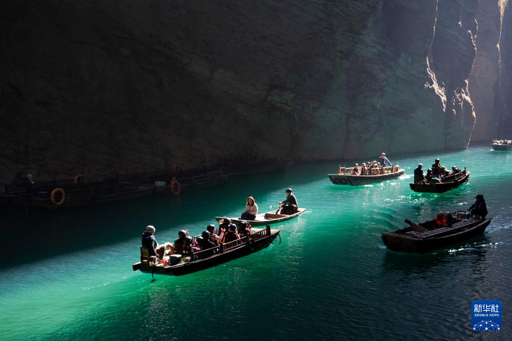 11月24日,游客在湖北省恩施土家族苗族自治州鹤峰县屏山峡谷坐船游玩。