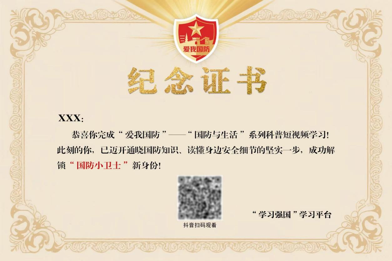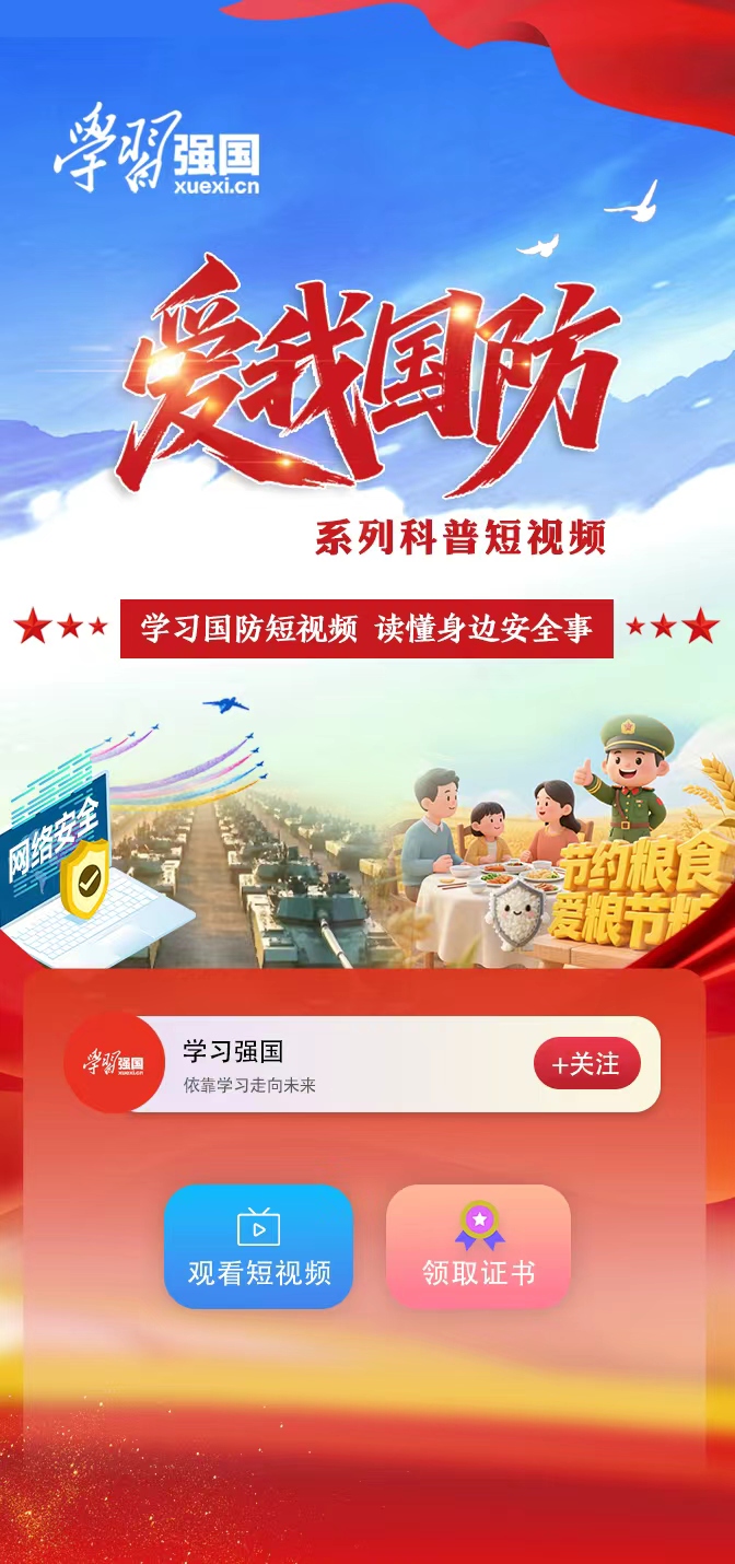 本次专题学习依托“学习强国”官方抖音、小红书账号,以系列科普短视频形式创新推出,认真学习《中华人民共和国国防教育法》,从生活看国防,从身边细节学国防,国防教育法、吃饭里的国防、上网中的国防、校园里的国防……从日常生活场景切入,解读生活与国防的关系,让人人理解和明白“国防就在身边”,切实做到人人都是国防的参与者、守护者。