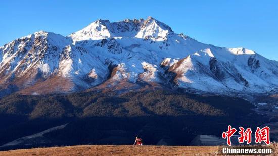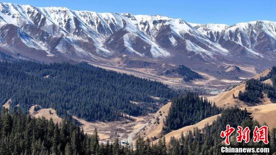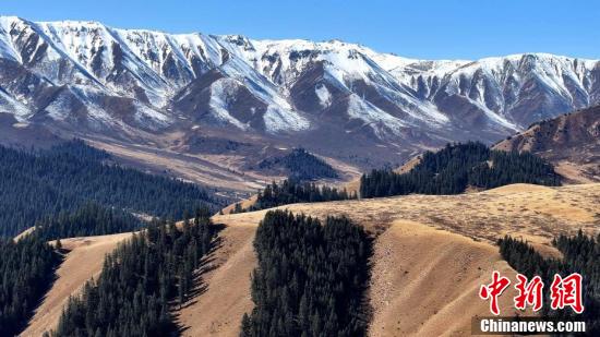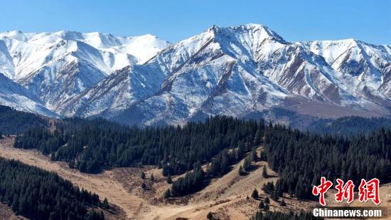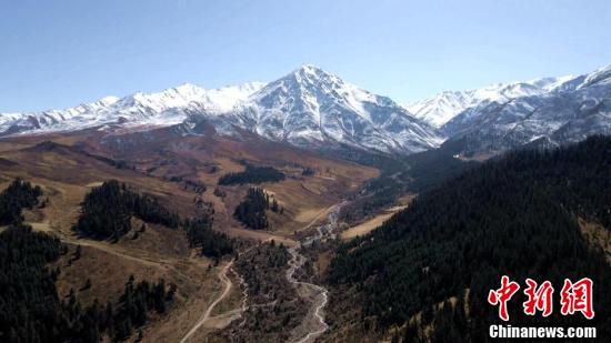 霜降时节,在位于祁连山腹地的青海省海北藏族自治州祁连县境内,在蓝天白云映衬下,雪山、草原、河流,构成了一幅别致美景,气势磅礴。图为祁连山与苍松翠柏构成的高原美景。