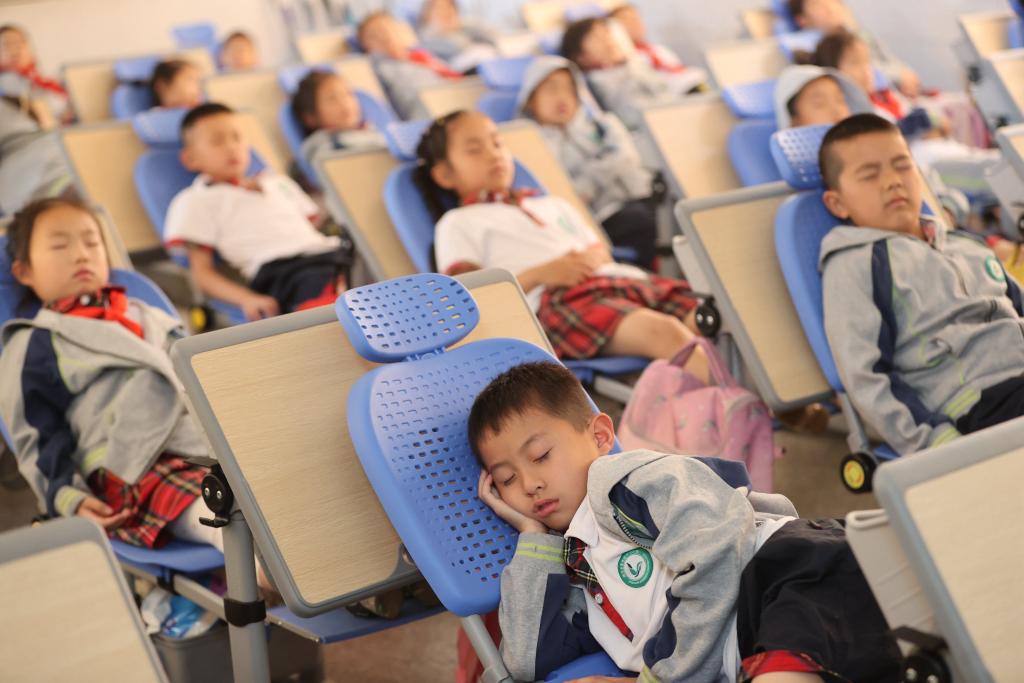 浙江省湖州市德清县雷甸镇中心小学通航校区学生使用可折叠课桌椅午休。新华社发(谢尚国 摄)