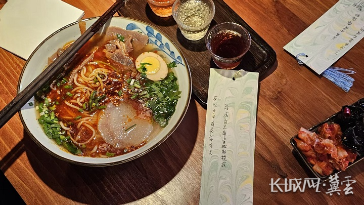 “无声面馆”里的牛肉面和手写祝福卡。闫思宇 摄