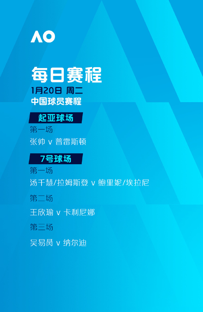 今天,2026年澳大利亚网球公开赛将迎来第三个比赛日。张帅、王欣瑜、吴易昺三位中国球员将冲击单打次轮。