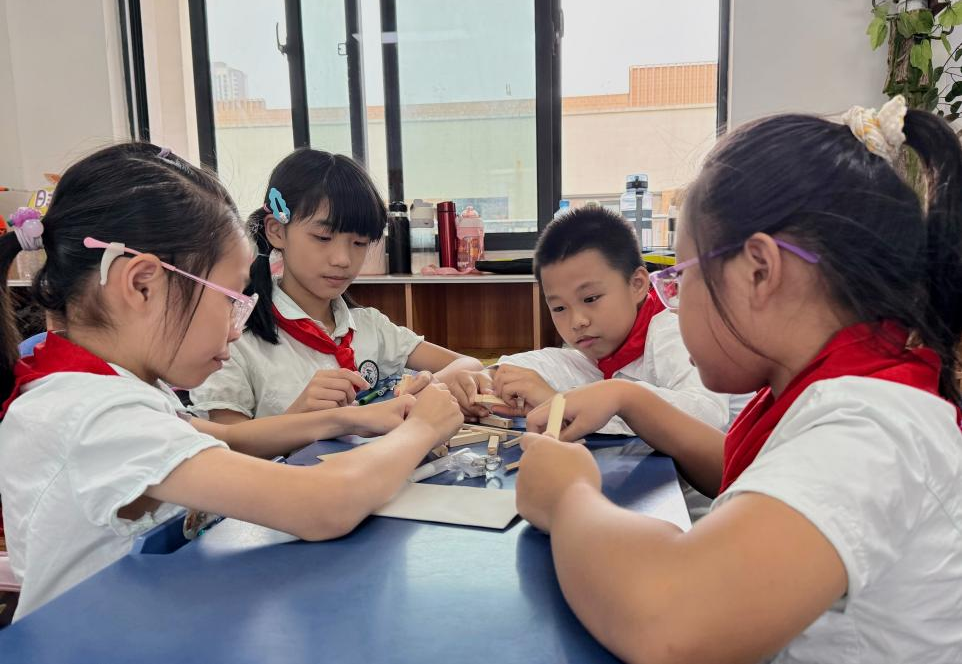 学生们一同观察榫卯木结构件,讨论如何组装榫卯小灯笼