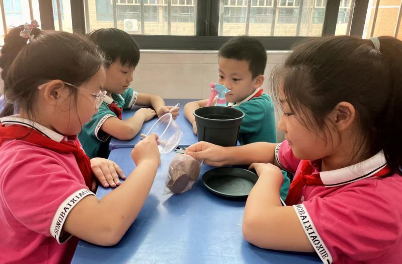 学校深度挖掘劳动教育课程资源包的实践价值,结合学生各学段特点以及资源包内的种植内容,利用课堂和校内实践基地开设了“青松小农场”系列课程。课程聚焦学生生活场景,推出“可爱多肉我来养”“水培大蒜作用大”“青菜种植有妙招”“薄荷种植欢乐多”等特色项目,让农业劳动贴近日常、触手可及。配套的课程材料中使用了椰糠代替了传统种植土,这种经无菌化处理、保水透气的新型栽培材料,既保留了传统农业“亲土劳作”的实践本质,又让种植变得更科学高效。