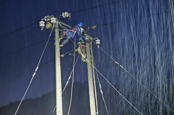 抢修现场,在做好停电安全措施保障后,党员突击队队员们不畏艰难、冲锋在前,迅速展开电力线路抢修。面对滑坡造成的复杂环境和受损严重的电力设施,党员突击队分工明确、协同作战,克服恶劣天气和施工难度大等重重困难,有条不紊地开展立杆、架线、接线等工作。“从白天到夜幕降临,再到寂静的深夜,突击队员们争分夺秒,一刻也不停歇。”荔波供电局业务经理李玉超说。经过12个小时的连续奋战,于6月22日零时,抢修工作顺利完成,电力成功恢复供应,大土苗寨又恢复光明。