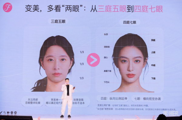 雍禾发之初首席美学设计官刘晓东表示,传统的三庭五眼审美体系只针对面部裸露区,而雍禾发之初将其升级为“四庭七眼”,构建起更容易打造“幼态脸”“头包脸”效果,帮助面部五官轮廓更立体、更精致的氛围感美学体系,并通过对女性气质与容貌特点的精准分类分型,进行个性化、定制化的美学设计。