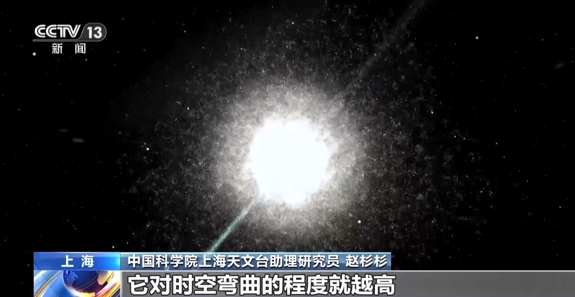 中国科学院上海天文台助理研究员 赵杉杉:在爱因斯坦的概念里,就是引力越强的天体,它对时空弯曲的程度就越高。那比如说我们地球,就是只能把时空弯曲一小点,然后太阳可以把时空弯曲得更多。在黑洞中心,可以把时空弯曲的程度达到无穷的这样一个天体,所以它对时空弯曲的能力是最强的。在弯曲的时空中,光线走的是一个曲线,所以我们看到的黑洞图像,是黑洞对它周围光线的扭曲所形成的一个非常神奇的一个环状的图像。