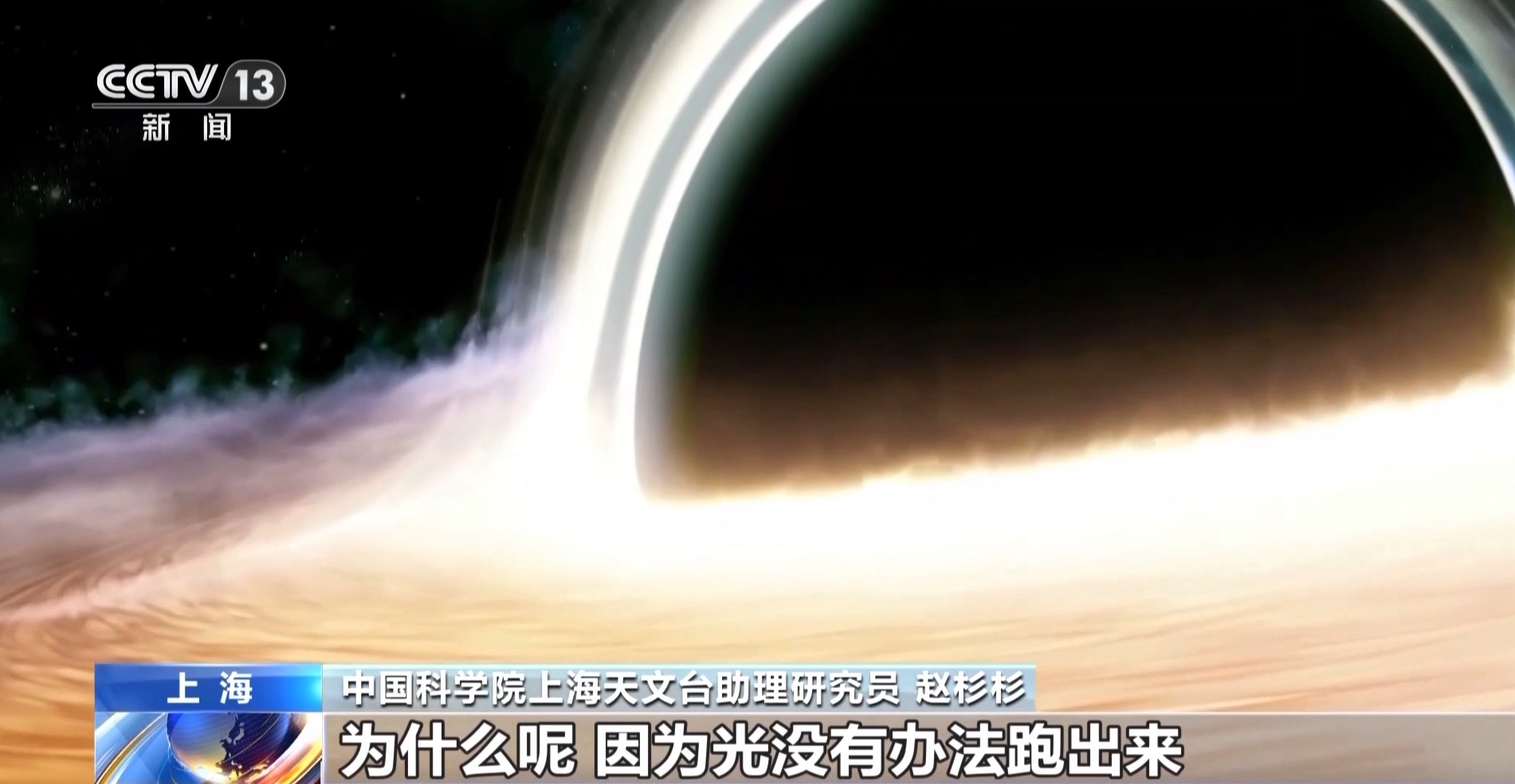 中国科学院上海天文台助理研究员 赵杉杉:黑洞它其实是比较晚才出现的这个名字,为什么呢?因为光没有办法跑出来,那它这个光跑不出来,所以它是黑的,那么叫黑洞。很多人都觉得很奇怪,说宇宙是黑暗的,黑洞也是黑暗的,那么你怎么可能可以从黑的里面看到一个黑的东西?我们看到的这个黑洞,它不是孤立在那的,它周围是有绕着它旋转的、非常炽热的、绕着它高速旋转的气体,绕着它旋转并且往里掉的气体,组成吸积盘。还有一些气体,被从它的两极喷出来,叫作喷流。那这个喷流和吸积盘,它们都是发光的,尽管黑洞本身它不发光,但是它周围的这些物质在发光。那么在这个发光的背景上看到一个黑的不发光的一个暗影,这样子我们就可以看到这个黑洞的图像了。