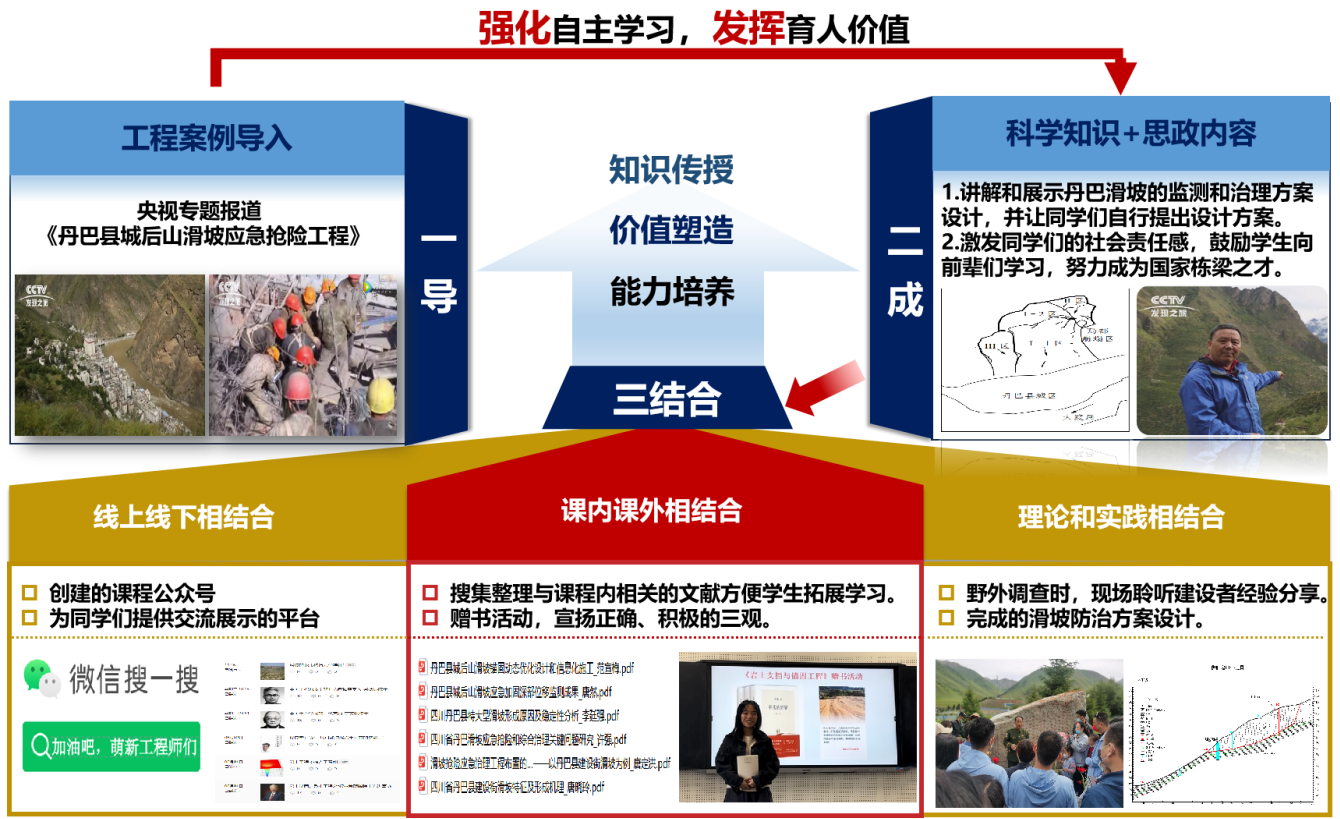 “一导二成三结合”模式创新:贯通教学全过程,实现价值塑造。团队设计了“一导二成三结合”的课程教学方式,把整个教学过程细分为课前、课中及课后三个阶段及线上、线下两种方式,教师采用引导式教学,学生进行探究式学习,利用“进阶式”的工程案例,不仅帮助学生一步步建立解决实际工程问题的思路,还能激发他们对专业的自豪感和荣誉感,强化信念担当意识。一导:即工程案例的导入,引入典型工程和知名专家学者作为有效育人载体,激发学生的好奇心和探索欲。“二成”:既科学知识与思政内容的相辅相成,在同一个工程案例中既讲清楚其中所应用的科学知识,还要自然地融入理想信念层面的精神指引。“三结合”:既线上线下相结合、课内课外相结合、理论与实践相结合。教学方式上强化“自主学习”,将课程思政内容融入教学的各个环节,充分发挥课程的育人价值(图3)。