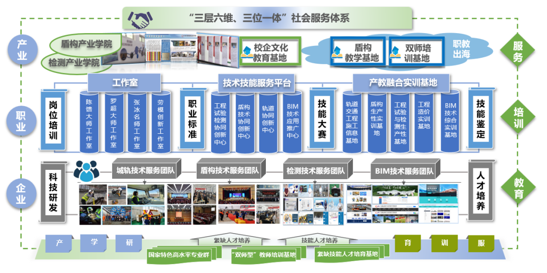 着力发挥专业群优势,立足服务产业、职业、企业“三层”,瞄准岗位培训、技能大赛、职业技能鉴定、职业标准标准、技术服务“六维”服务目标,教育、培训、服务一体化设计,通过增强服务意识、搭建技服平台、创新团队建设等多渠道实施,创新了“三层六维、三位一体”服务新体系,打造城轨交通产业领域“产学研”一体化高素质技能人才培养阵地,促进专业群可持续发展,推进产教深度融合。