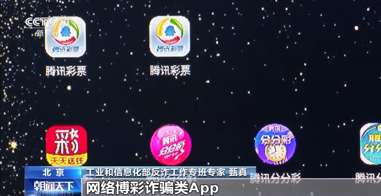 工业和信息化部反诈工作专班专家 甄真:一种是仿冒电商平台,引导用户在仿冒App中进行购物、刷单等操作;另外一种就是打着知名互联网企业旗号,虚构一些博彩类、色情类的违规App,引诱用户进行充值,比如这款名叫“腾讯彩票”的网络博彩诈骗App,实际与腾讯完全无关,但是用户不一定能分辨得出来。