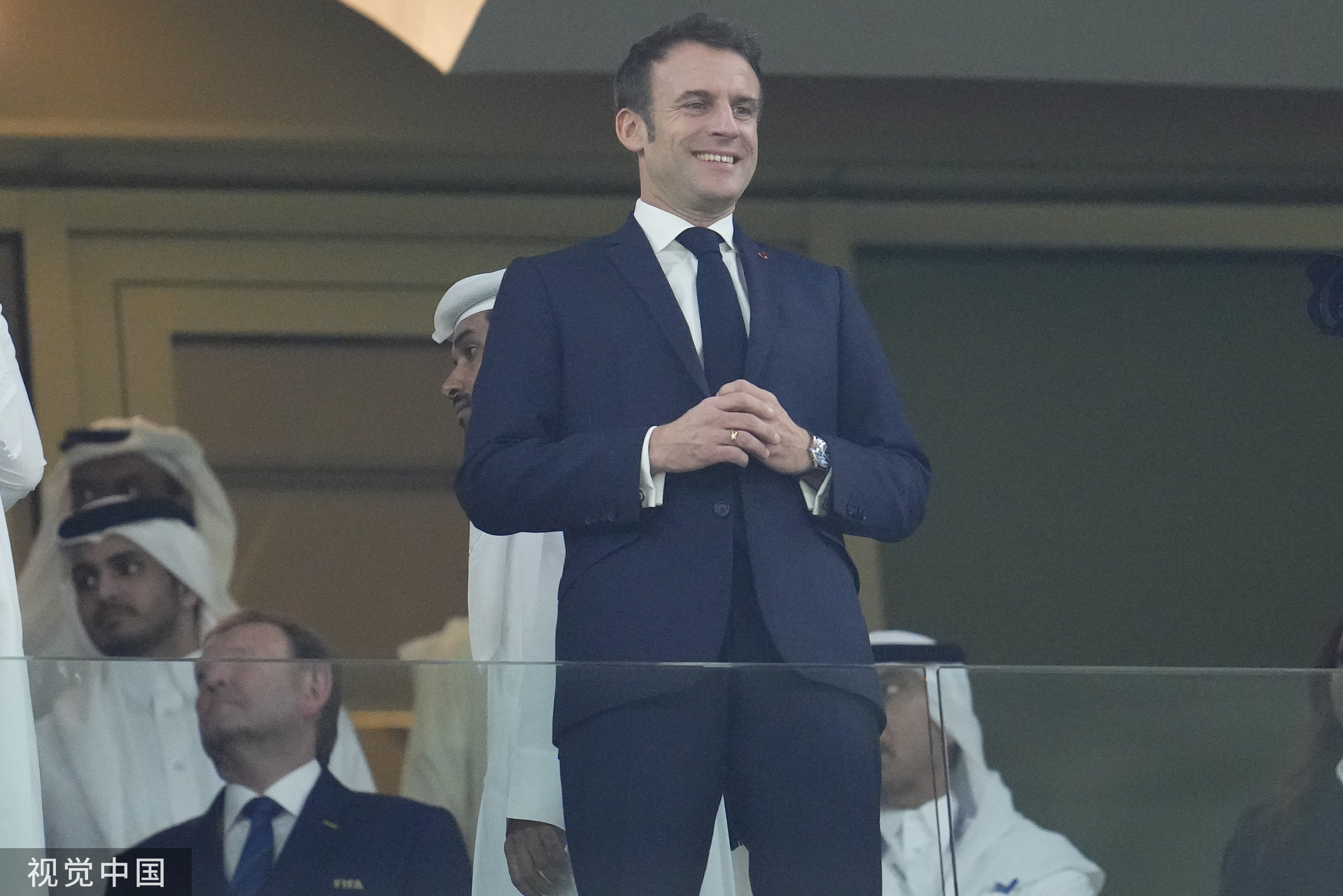 尽管法国队的现场球迷人数不及阿根廷队,但是法国总统马克龙依旧充满热情。