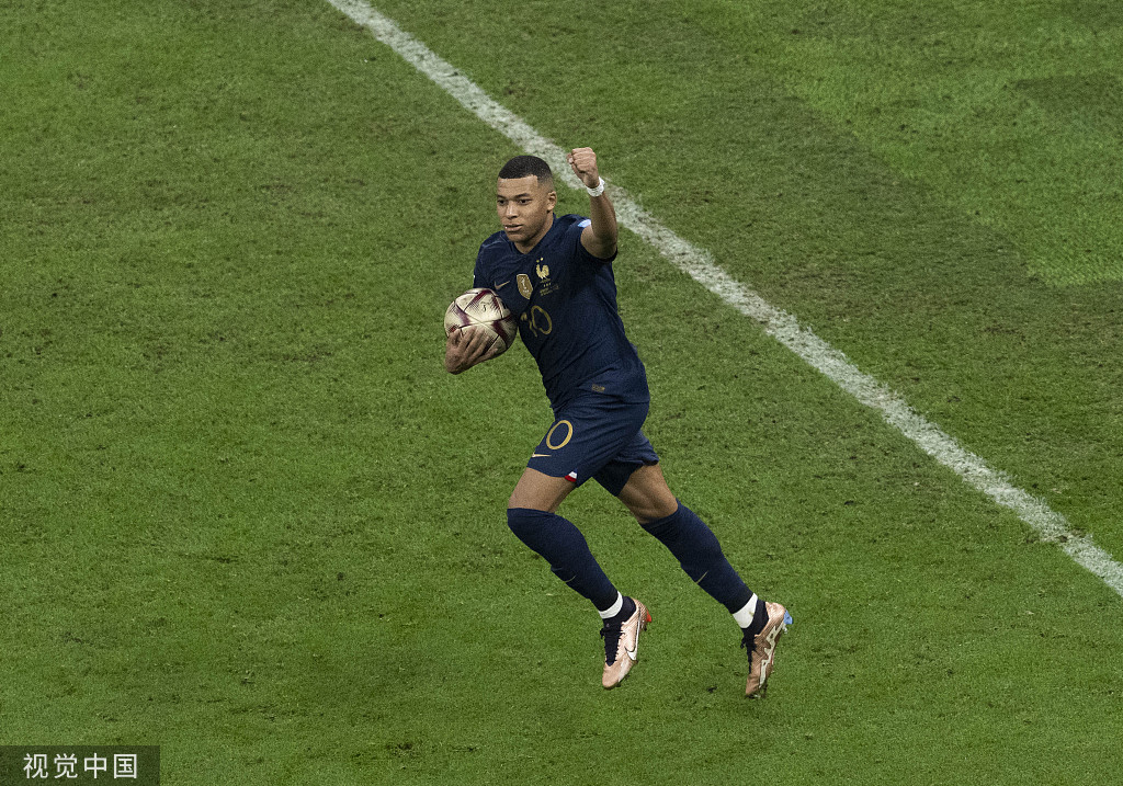 比赛还没有结束!由于蒙铁尔的手球,法国队在116分钟获得点球——姆巴佩一蹴而就,上演帽子戏法,打进了本届赛事个人第8球!