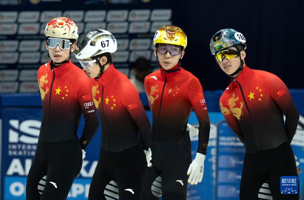 3月13日,中国队选手李坤、宋桂旭、张柏浩、朱祎玎(从左到右)在男子5000米接力四分之一决赛前。最终,中国队晋级半决赛。
