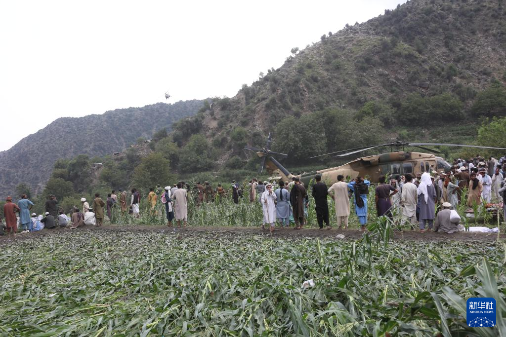 9月1日,在阿富汗库纳尔省努尔加尔的马扎里峡谷,人们聚集在救援直升机附近。新华社发(塞夫拉赫曼·萨菲摄)