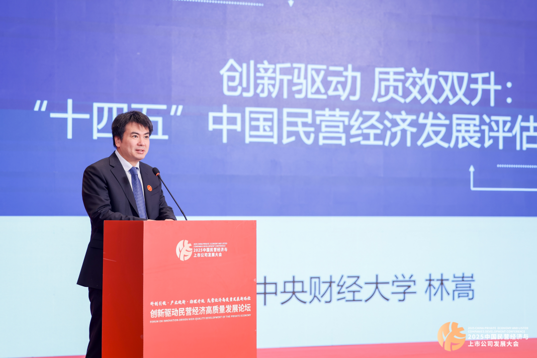 图为中央财经大学商学院院长林嵩发布《创新驱动 质效双升:“十四五”中国民营经济发展评估与展望报告》。新华网发