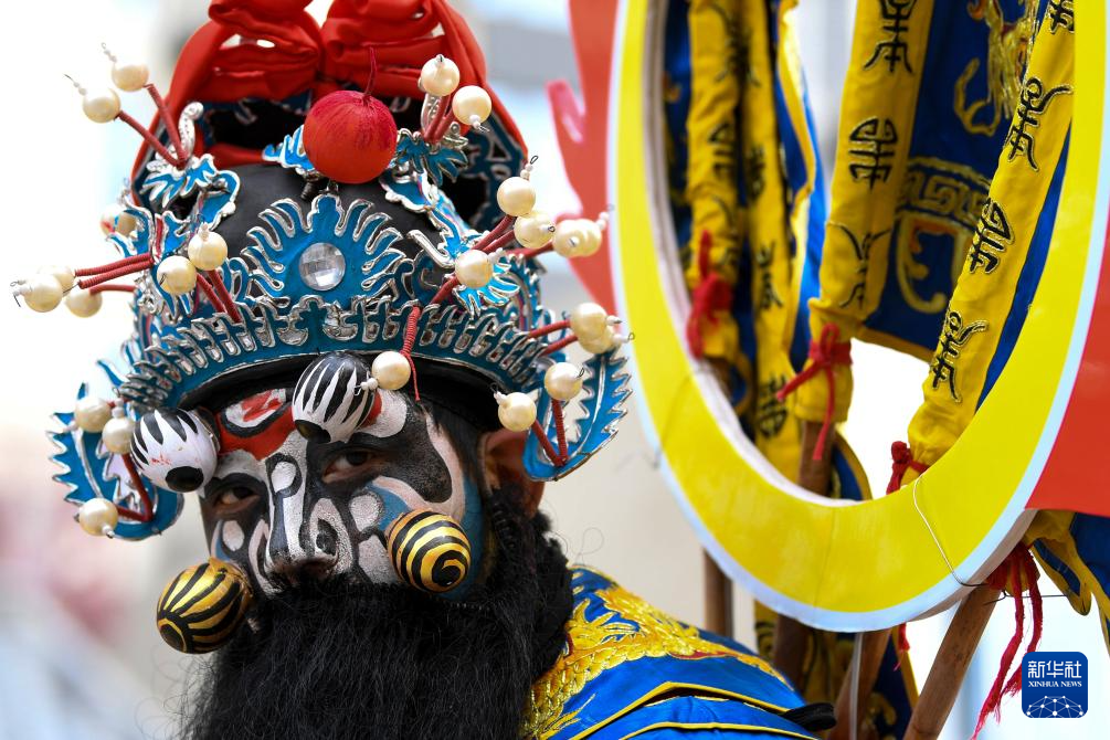 3月3日,一名马社火演员在陇县元宵节社火巡游活动上展示疙瘩脸谱。
