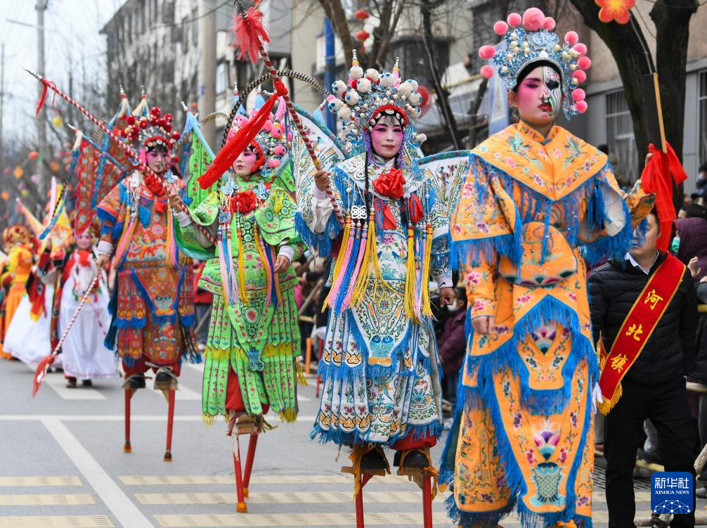 3月3日,演员在陇县元宵节社火巡游活动上表演踩高跷。