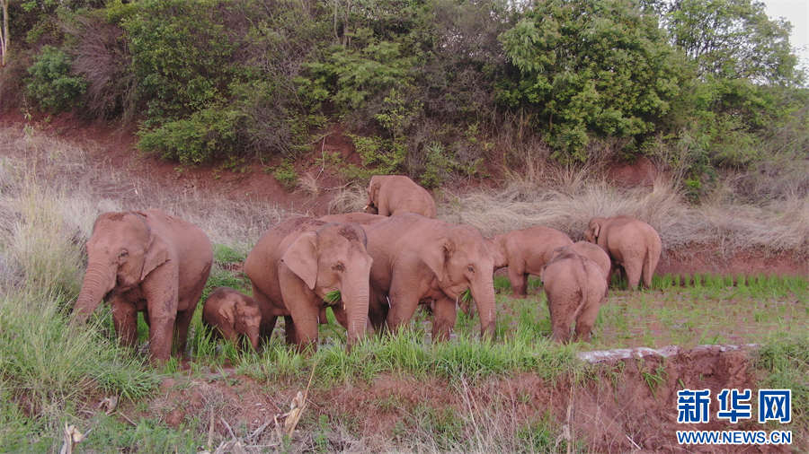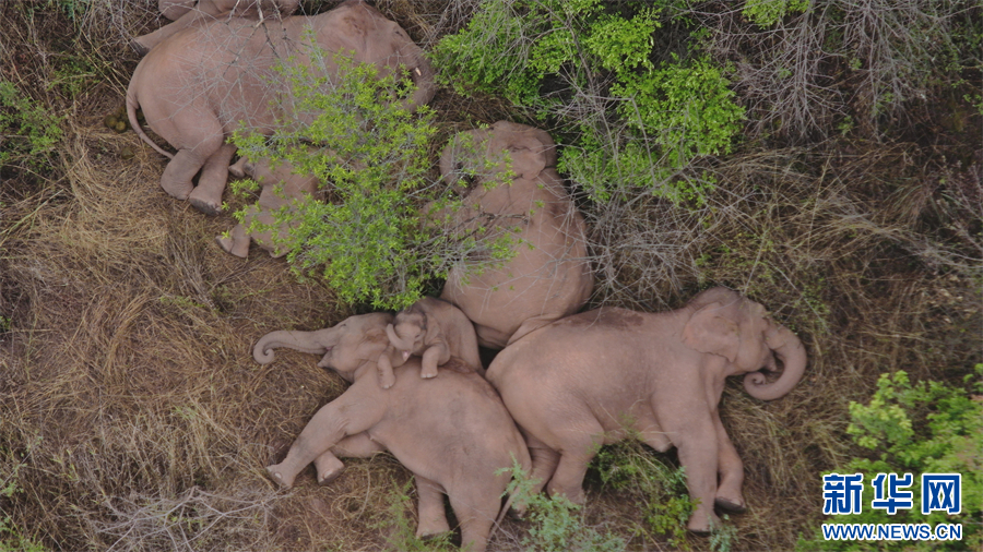象群北上南归途中的温馨画面(资料图)。新华网发(云南省森林消防总队 供图)