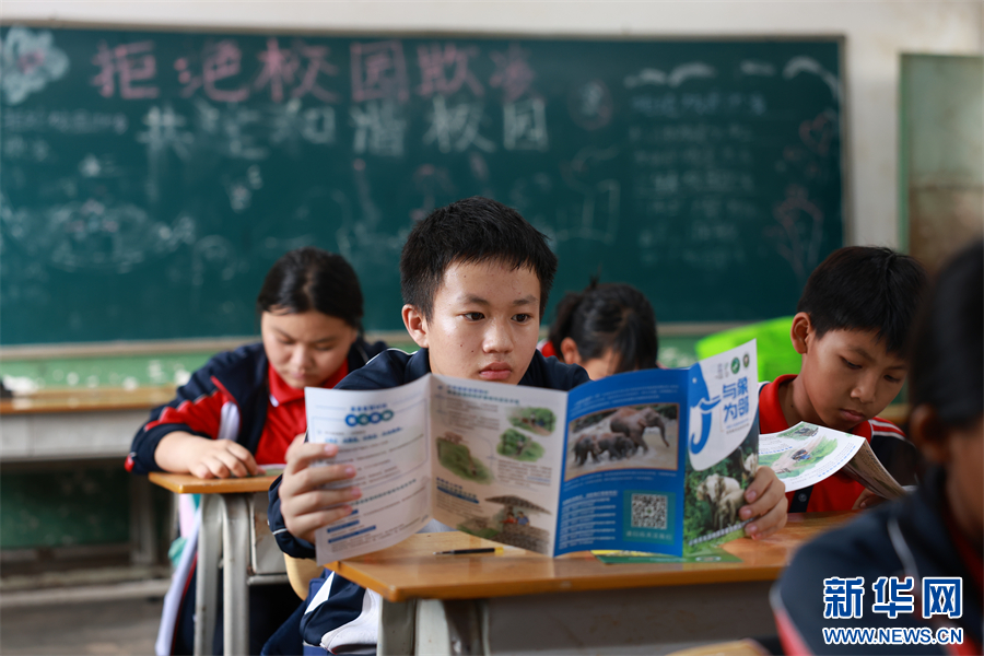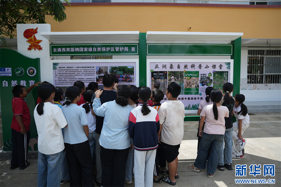 关坪小学的师生观看亚洲象知识宣传展板(6月26日摄)。新华网发