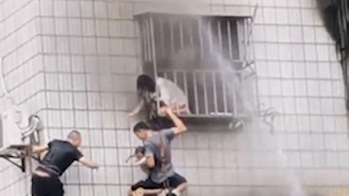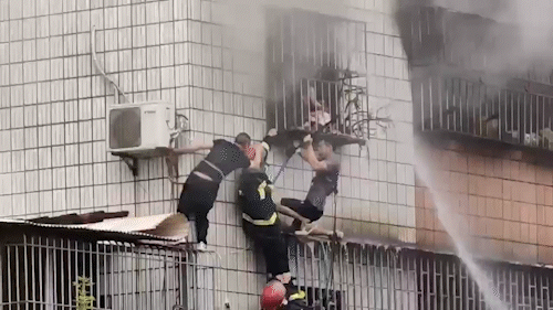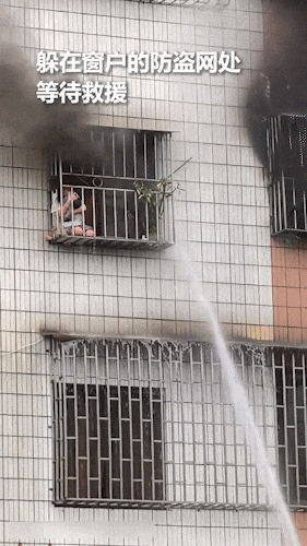 只能躲在窗户的防盗网处等待救援