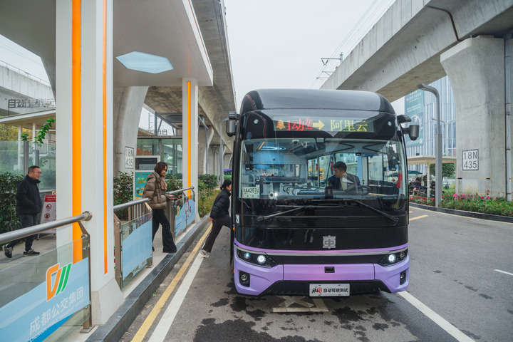 清晨,四川省成都市未来科技城的福田TOD地铁站旁,一辆深紫色的自动驾驶公交车缓缓靠岸,随后车门自动弹开,等待乘客上车。