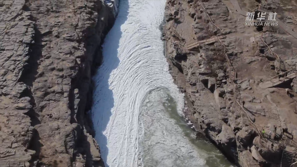 近日,受持续降温天气影响,黄河晋陕峡谷流凌密度持续增大,滚滚黄河水裹挟着大量的流凌浮跃而下,在黄河壶口瀑布下游十里龙槽堆积凝结,形成今年的首次流凌封河景观。