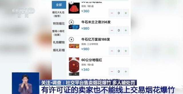 售卖烟花必须有许可证,而即使是有许可证的卖家,也只能在固定的线下场所经营,不能线上交易。然而,最近记者在多个社交平台发现,兜售各类烟花爆竹的信息五花八门,甚至有人直播卖烟花,并称多数地区可发货。