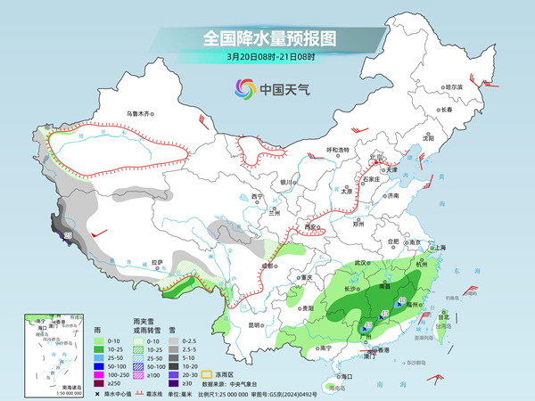 具体地,中央气象台预计,今天,新疆南疆西部山区、西藏西部和南部、青海南部、川西高原北部等地部分地区有小到中雪或雨夹雪,其中,西藏西部等地部分地区有大到暴雪,局地大暴雪。贵州东部、江南大部、华南北部和西部、海南岛中部、台湾岛东部等地部分地区有小到中雨,其中,江西南部、福建西部、广东西北部等地部分地区有大雨。