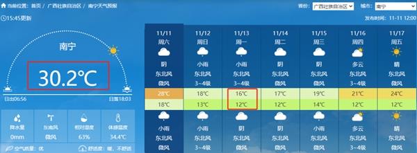 可以看到,南昌、上海、贵阳、重庆、南宁等地最高气温和最低气温都将持续刷新低,气温步步探底。尤其南宁,今天最高气温还在30℃以上,后天最高气温直接打五折,仅16℃左右,最低气温也只有12℃左右,倏忽到深秋,短袖换棉服,加上还有阴雨天气,湿冷加剧!