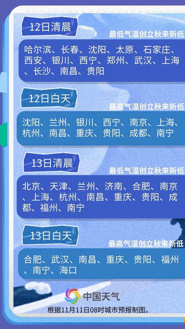 本轮冷空气过程的气温低点正在到来!今天(11日)早晨,最低气温出现大面积新低,哈尔滨、长春、沈阳、北京、天津、石家庄、西安、济南、郑州、长沙、南昌以及福州等12个省会级大城市最低气温均创下半年新低,其中济南为下半年首次破0℃。