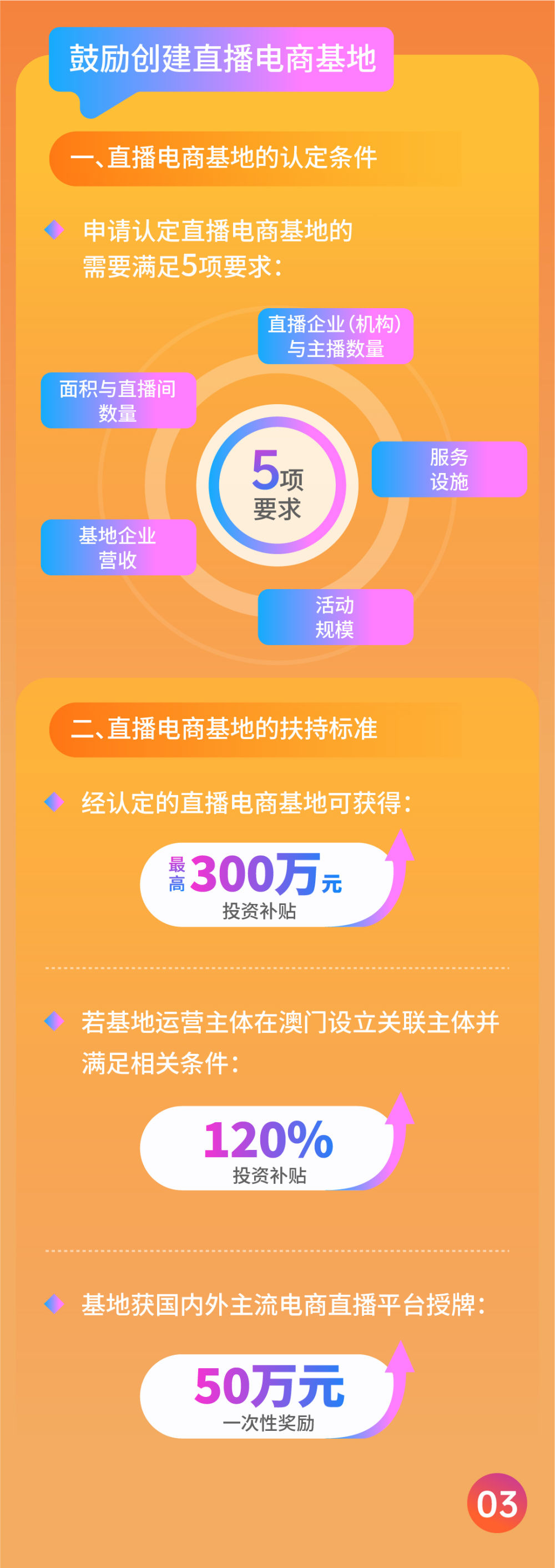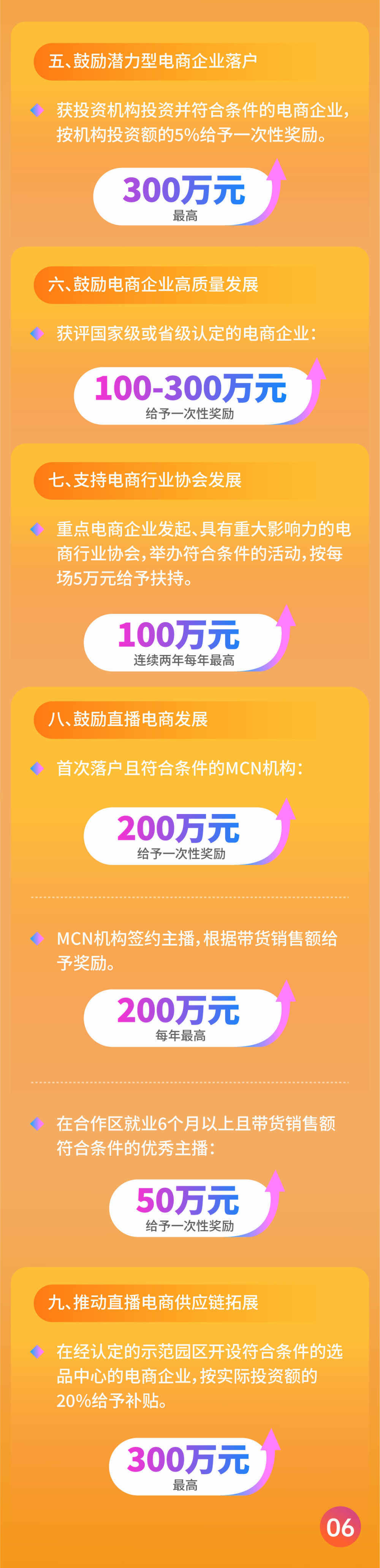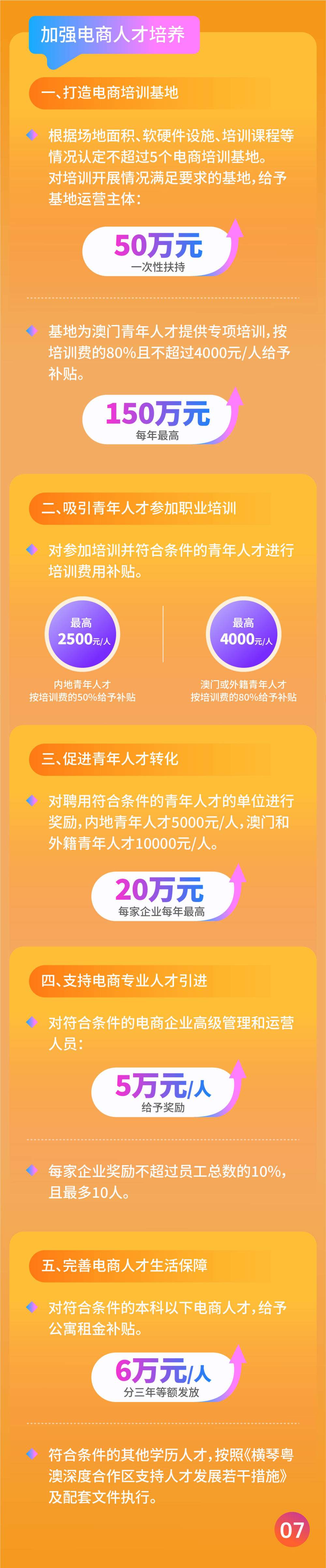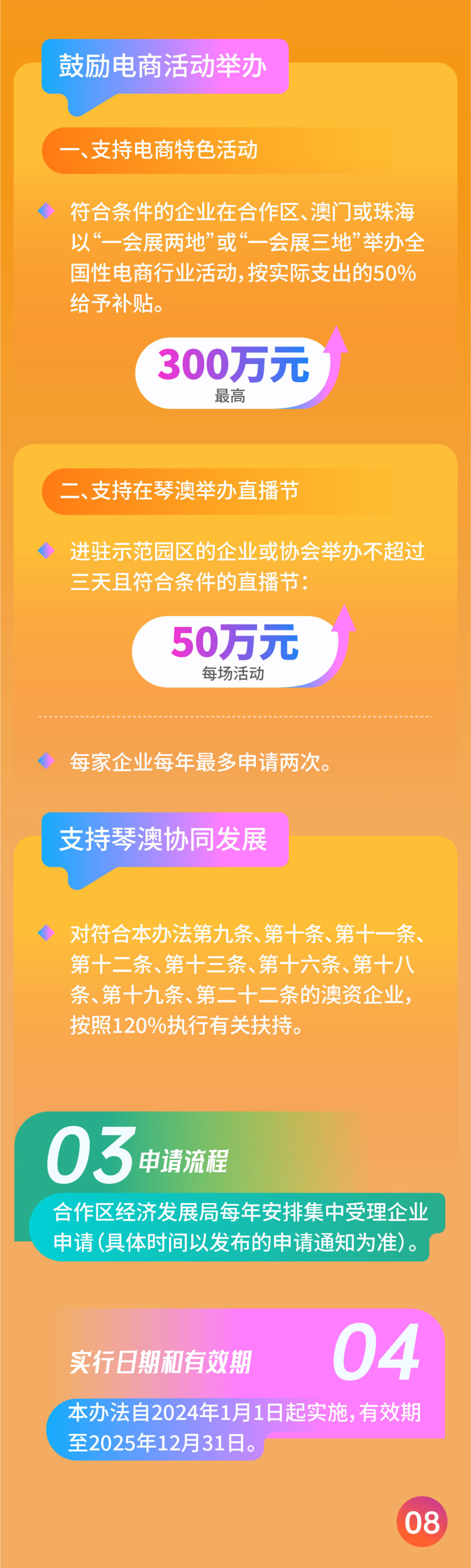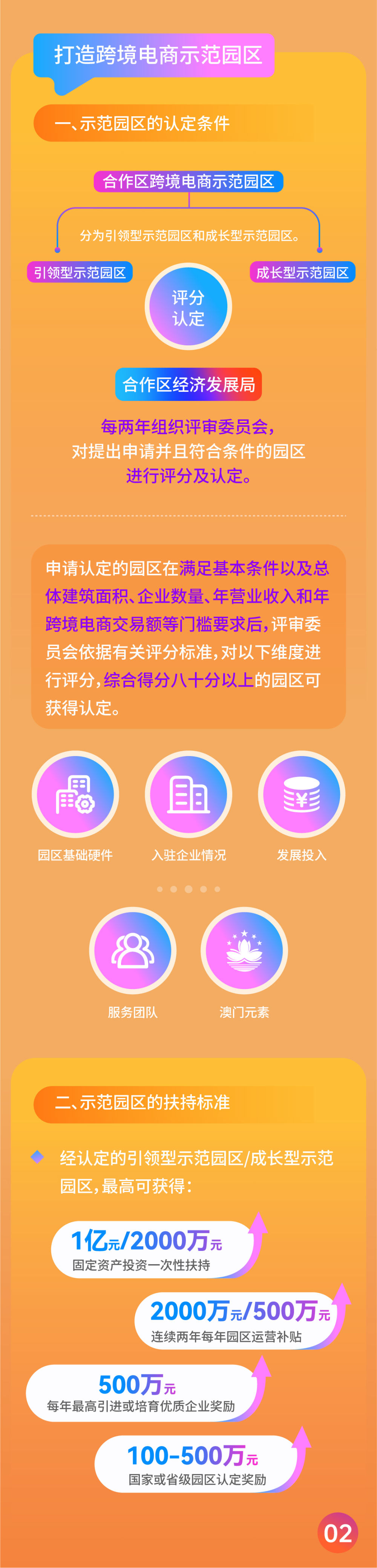 《扶持办法》分为九章三十七条,共涉及二十三条扶持政策,从打造跨境电商示范园区、构建产业生态、推动电商企业集聚、加强电商人才培养和鼓励电商活动举办以及支持琴澳协同发展等多个维度,围绕「筑巢(园区)」「引凤(企业)」「纳才(人才)」「聚势(活动)」四大要素精准施策,全方位推动合作区跨境电商产业步入高质量发展快车道。其中,有九条措施对澳资企业的扶持标准按照1.2倍执行,加强琴澳产业协同,促进澳门产业多元发展。