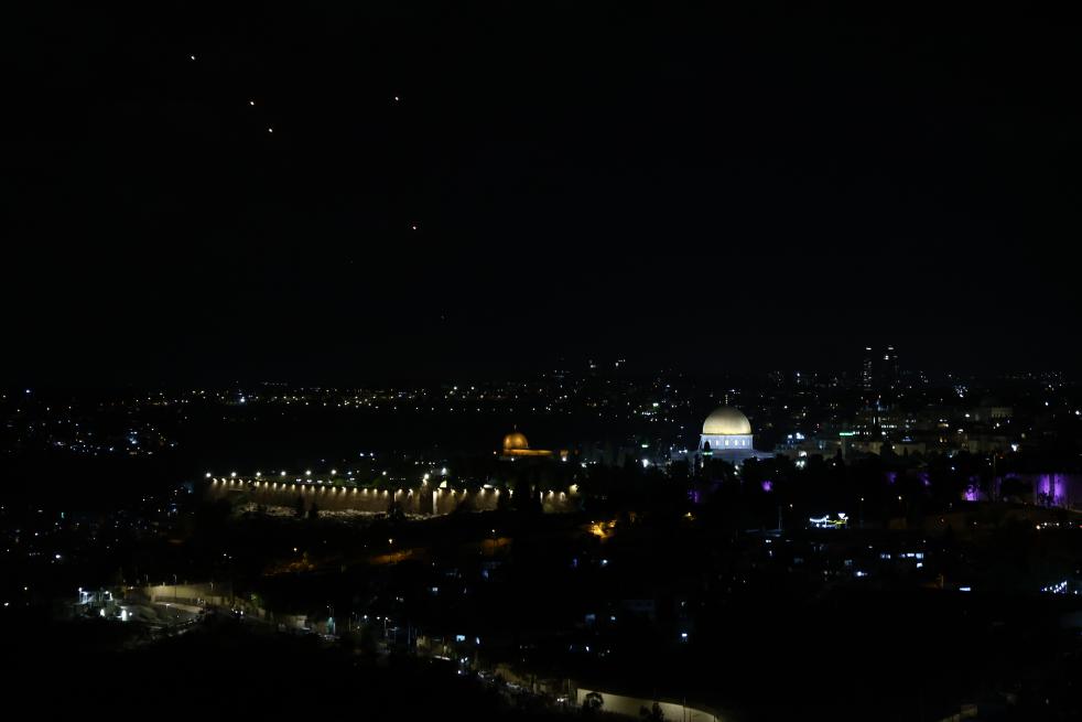 10月1日,以军防空系统拦截的发射物从耶路撒冷上空飞过。新华社发(贾马尔·阿瓦德摄)
