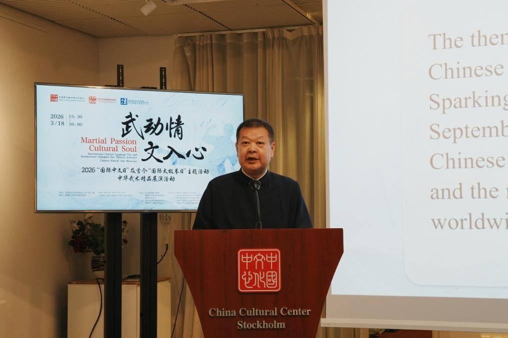3月18日,由中国驻瑞典大使馆和斯德哥尔摩中国文化中心联合主办的2026年“国际中文日”及首个“国际太极拳日”主题活动在斯德哥尔摩举办。中国驻瑞典大使周立民、使馆负责教育文化事务的参赞黄立琼和李蕊、乌普萨拉大学中文教授阎幽磬、瑞典武术与功夫联合会主席芬西奥、北京体育大学教授武冬及当地学校师生百余人参加。