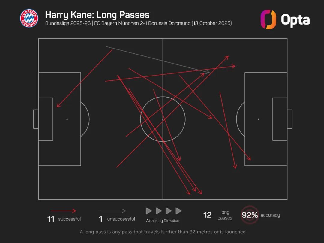 根据赛后的统计数据,凯恩本场比赛的表现堪称“覆盖全场”,他的作用绝对不仅仅体现在进球上,他在助攻、拼抢和防守上面一样投入,本场比赛凯恩一共完成了11次的成功长传,创下了他在欧洲五大联赛单场长传的个人新高。凯恩现在不是待在禁区里等待机会的前锋,不是传统意义上的“9号”球员,而是一个更全面的球员,可以说凯恩的存在让拜仁攻防两端都变得更平衡。