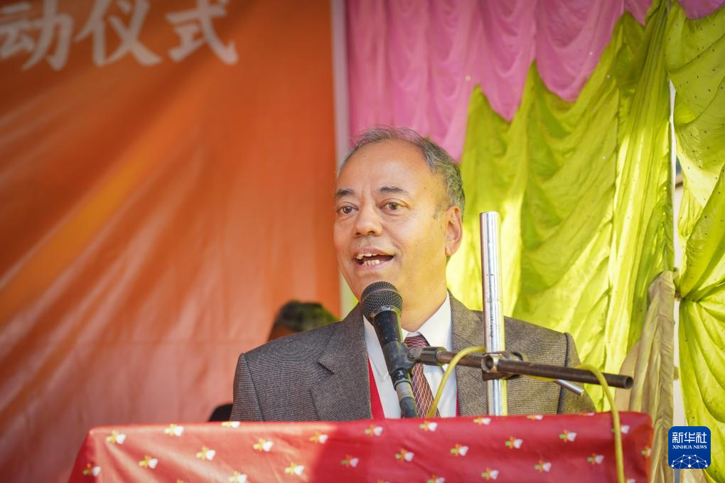 12月14日,在尼泊尔加德满都谷地城市巴克塔普尔,尼泊尔阿尼哥协会第一副主席塔姆在活动启动仪式上致辞。新华社发(哈里·马哈尔詹摄)
