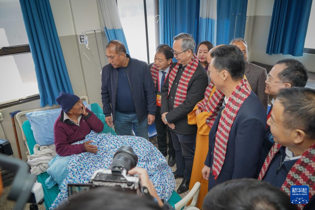 12月14日,在尼泊尔加德满都谷地城市巴克塔普尔参加活动启动仪式的嘉宾探望一名已接受白内障手术的患者。新华社发(哈里·马哈尔詹摄)
