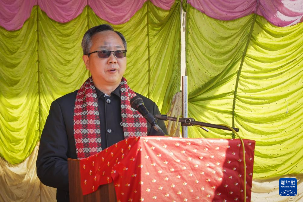 12月14日,在尼泊尔加德满都谷地城市巴克塔普尔,中国驻尼泊尔大使陈松在活动启动仪式上致辞。新华社发(哈里·马哈尔詹摄)