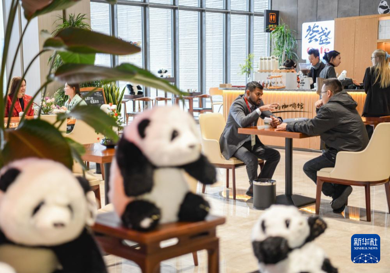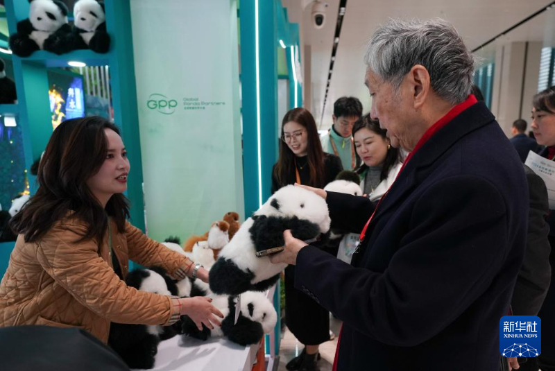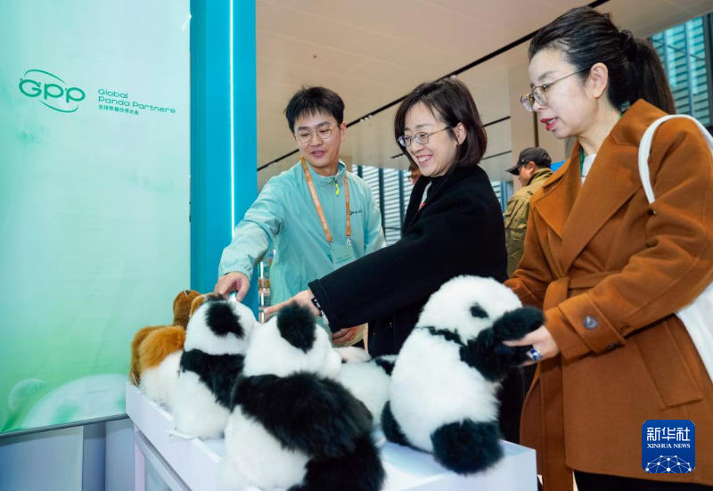 11月26日,嘉宾在会场观看大熊猫玩偶。新华社记者 胥冰洁 摄