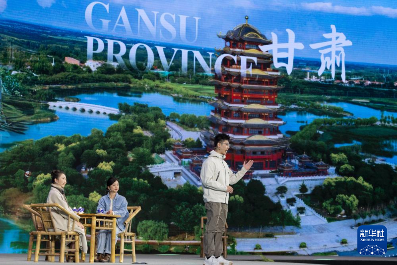 11月26日,在2024全球熊猫伙伴大会上,来自四川、甘肃、陕西的三位年轻人在推荐生态旅游资源。新华社记者 江宏景 摄