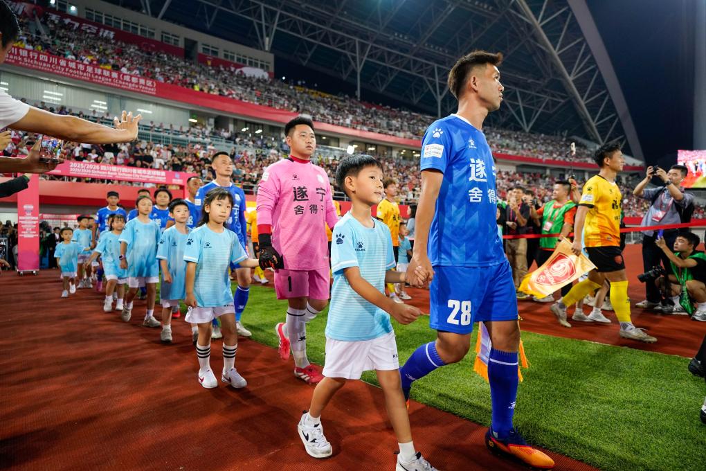 9月20日,成都队和遂宁队的双方球员在赛前入场。新华社记者 胥冰洁 摄
