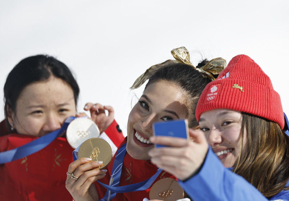 2月22日,季军英国选手阿特金、冠军中国选手谷爱凌、亚军中国选手李方慧(从右至左)在颁奖仪式上自拍。新华社记者 王鹏 摄