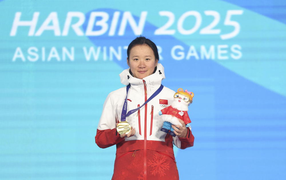 2025年2月8日,冠军中国选手李方慧在第九届亚冬会自由式滑雪女子U型场地技巧颁奖仪式上。新华社记者 杨青 摄