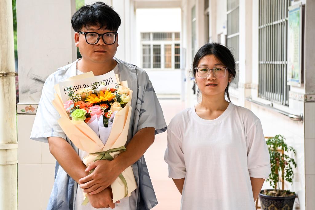 2025年6月13日,在广西桂林市灌阳县第二高级中学,刘燕(右)为班主任陈庆隆送上鲜花后合影。