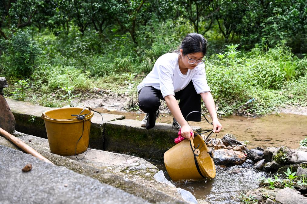 2025年6月13日,刘燕用水桶取水准备给自家菜地浇水。
