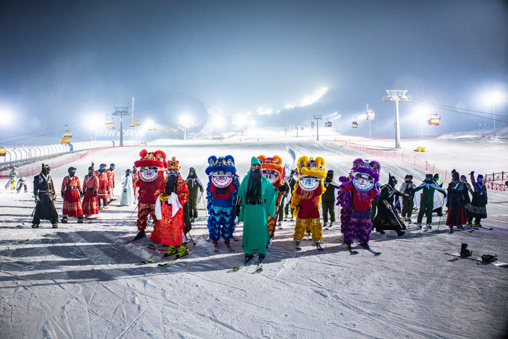 20名身着京剧、川剧等服饰的滑雪爱好者